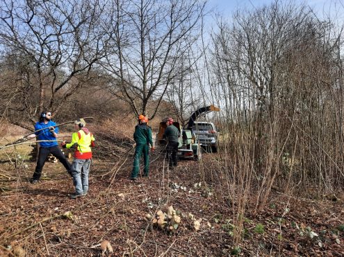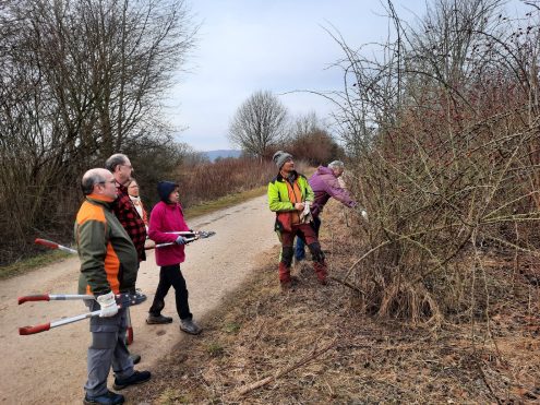 Der hauptamtliche Pflegetrupp des Schwäbischen Albvereins, hatte bereits in den Tagen vor dem Einsatz umfangreiche Vorarbeiten geleistet und die Feldhecken zurückgeschnitten. Aufgabe der Freiwilligen war daher vor allem – nach Einweisung von Reinhard Jetter – das Häckseln des Schnittgutes, der Schnitt der Wildrosen sowie das Eindämmen der Brombeersträucher in die angrenzende landwirtschaftliche Fläche. Mit einer Heckenschere und Handschuhen ausgestattet, machten sich die Freiwilligen engagiert an die Arbeit und trotzten den Dornen der Brombeeren. Es war beeindruckend zu sehen, wie viel man gemeinsam erreichen kann, wenn jeder Hand anlegt.