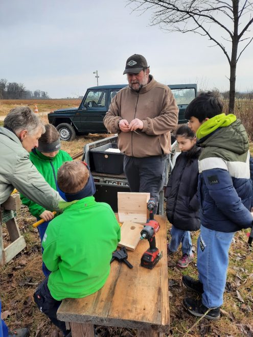 Deshalb waren bei dieser Landschafspflegetag auch Kinder eingebunden. Sie bauten unter Anleitung von Gerhard Kurz jeweils einen Nistkasten oder bohrten zahlreiche Nisthölzer, die im Wildbienenstand beim Wildrosenlehrpfad untergebracht wurden.