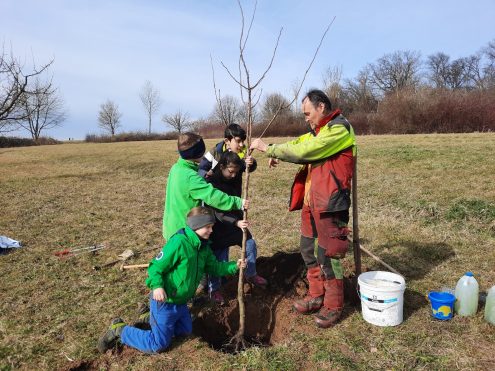 Des Weiteren pflanzten die Kinder auch eine Mispel. Die Obstbaumsorte ist in Vergessenheit geraten und ist eine Schmetterlingsfutterpflanze sowie ein Vogelschutz- und Nährgehölz.