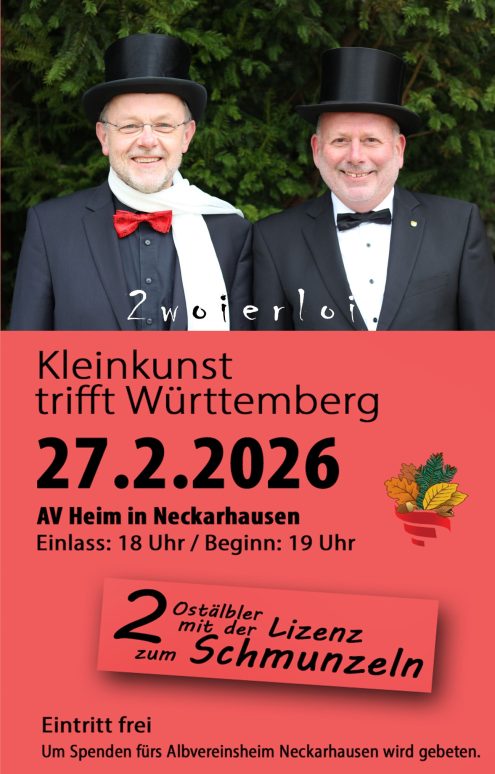 am Freitag, 27.02.2026 um 19 Uhr. Einlass ist ab 18 Uhr, der Eintritt ist frei. Um Spenden für die Renovierung des Albvereinsheims Neckarhausen wird gebeten.