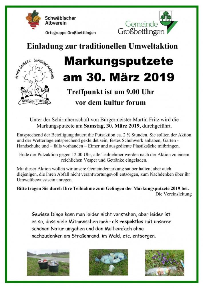 Markungsputzete Sa., 30.03.2019, Großbettlingen Uhrzeit: 09:00 Ort: Großbettlingen Scheidwasenstr. 3 72663 Großbettlingen iCalendar Mit dem Laden der Karte akzeptieren Sie die Datenschutzerklärung von Google.Mehr erfahren Karte laden Google Maps immer entsperren zur Übersicht